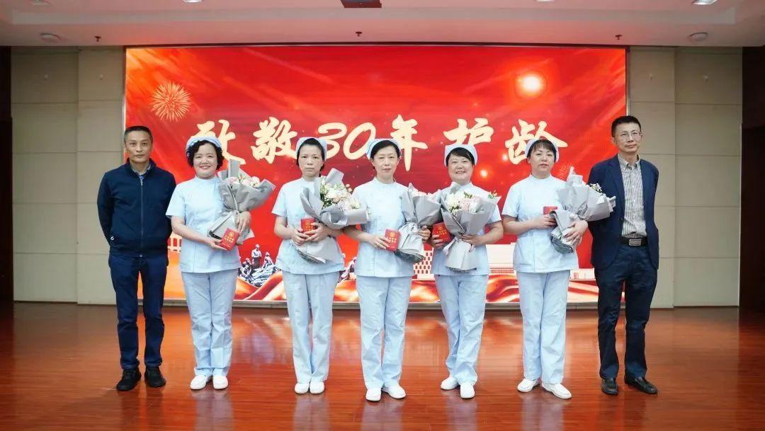 院领导向30年护龄的老师献上鲜花并颁发纪念章,感谢他们30年来默默坚守、无私奉献,廖晓骏护士长作为30年护龄代表发表感言,从初入职场到中坚力量再到深入职场,30年护龄工作者以工匠精神致敬新时代。