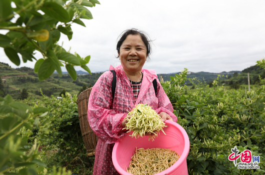 今年“五一节”过后的农忙季节,村民每天起早摸黑,下地入园抢抓花期采摘金银花,就近就地就业打工挣钱,通过辛勤劳动获得可观的收入。集团公司支付每斤6元的采摘费,平均每天每人可采摘20斤以上,收入150元左右。目前每天每人采花30-40斤的大量涌现,“采花冠军”王铜罐村的郑大菊一天采摘44斤鲜花,收入264元,是当地劳动单价的4.4倍。由于收入可观,赛金镇街的街谈巷议都是采摘金银花的话题,相约上山采花挣钱的人员日溢增加,采花热情日溢高涨,热火朝天的劳动场面蔚为壮观。