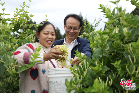 为了进一步了解金银花产业园区的生产、管理、采花、发展前景以及农民收入等方面的情况,耿福能董事长近日前往仪陇金银花基地实地考察调研。他先后到鹏锦合作社、农旺耘合作社和军豪合作社的金银花田间地头,与三个合作社的干部和正在采花的群众交心谈心,倾听意见,了解民情,探索进一步发展的新路子。耿福能董事长还亲自下地摘花,体验摘花的快乐和劳动的光荣,并现场对采花群众进行政策宣传、种植技术培训和摘花技巧指导。鹏锦合作社理事长代群英和耿福能董事长交流:好医生集团到仪陇投资建设金银花产业园区,不仅为农民创造了就业增收的机会,还促进了各村基础设施建设,村容村貌也大为改观。村里的交通路,园区的产业路四通八达,以前的羊肠小道和泥巴路彻底变成了历史,25个储水池、3个大堰塘和一个提灌站也分布有序地建起来了,村民出行便捷,用水方便,电有保障,网络畅通,大家买了小汽车、三轮车或摩托车,日子过得越来越滋润。龙旺耘合作社理事长邓斌欣喜地说:“我负责管理400亩金银花,常年安置就业100人左右。我今年的目标是采收65000斤金银花,我有信心完成这个任务,让合作社和村民获得更多的收益。”军毫合作社理事长漆小琼说:“我们合作社的金银花长得非常好,繁花开放忙不赢,大家对金银花产业产生了深厚的感情,每天都有很多人自愿进园区采花。村民每年从金银花产业园区获得的土地流转、田间管护、采摘鲜花和承做杂活4项收入户均达到2万元以上,精神面貌改观,精神文明水平大为提高。”园区干部群众纷纷向耿福能董事长表达了共同的心愿:感谢党和国家乡村振兴的好政策,感谢好医生集团带来富民产业,感谢耿福能董事长的大力支持和大爱善举!