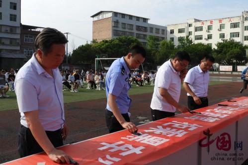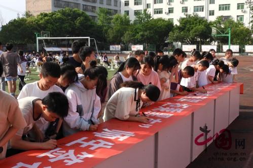李金城同志带领师生在“杜绝酒驾 拒乘黑车”的宣传横幅上签名并许下承诺,全体师生认真听取和学习交通安全知识,主动参与签名活动。