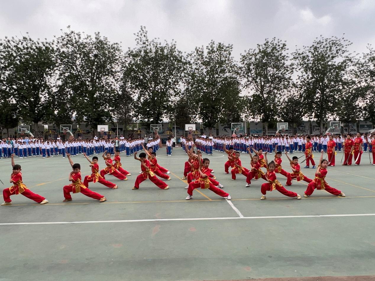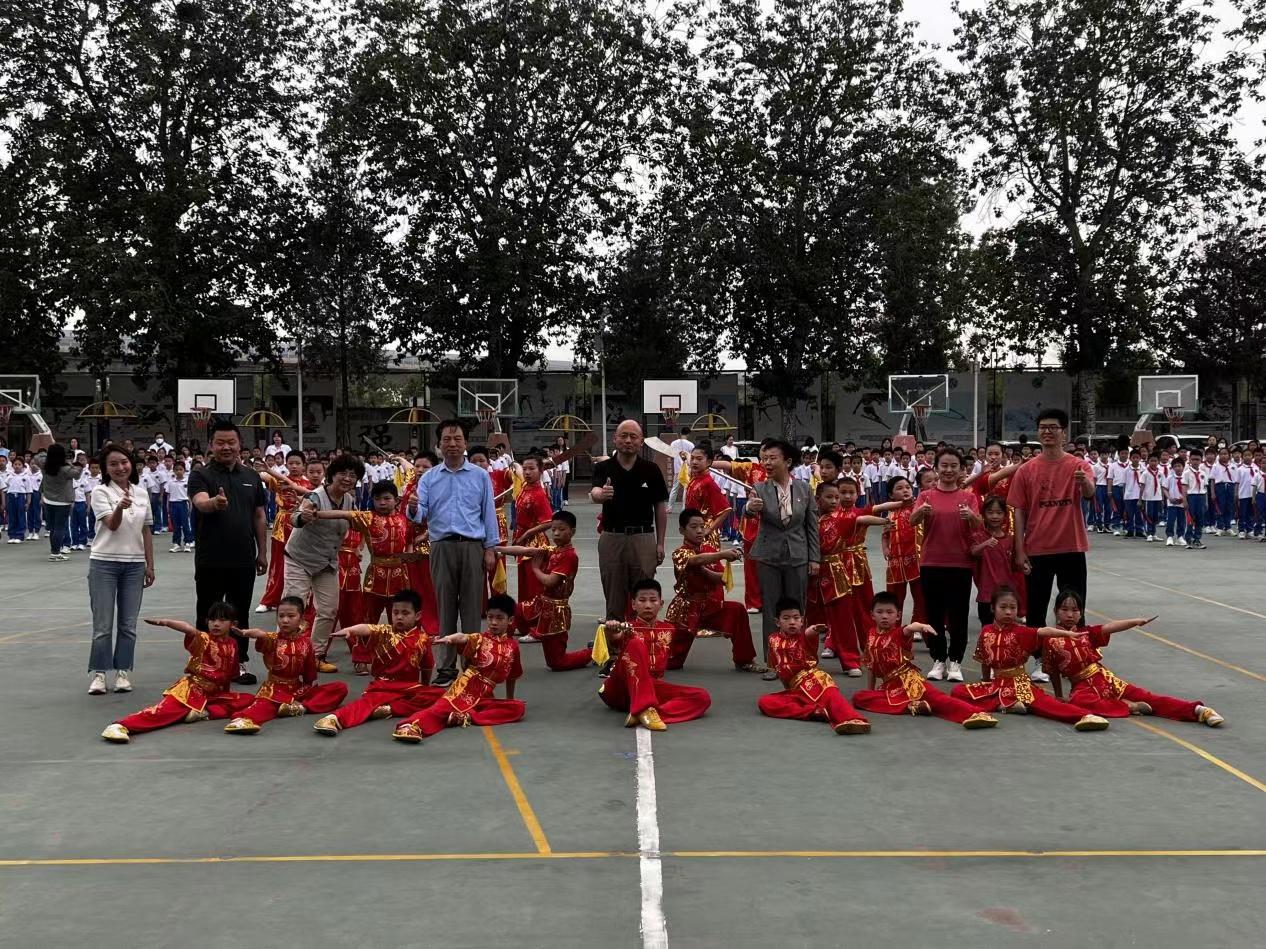 在展示环节,由二至六年级同学带来了少年长拳、功夫扇、太极拳表演。扬帆起航播希望,硕果满枝迎明天,今年4月份,北京工业大学附中十八里店分校武术队在朝阳区教委主办的2023年武术大赛上以总分261分的成绩再次蝉联团体总分第一名,将金灿灿的冠军奖杯赢回了学校,而且还获得了最佳组织奖。柴克俭书记和杨玉芹校长为获奖队员代表颁发冠军奖杯。随后校武术队进行了精彩展示。