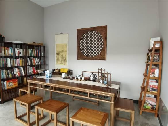 不仅如此,罗智勇的妻子作为高级茶艺师,也对半园有着自己独特的审美。走进民宿内,映入眼帘的是一个清雅的茶室,茶室后是一间书吧,配着满屋的字画和旧物,一股幽雅的气息扑面而来。“这个书吧是公益性书吧,平时都是免费对外开放的,一天要来好几拨客人在此品茗、看书。”