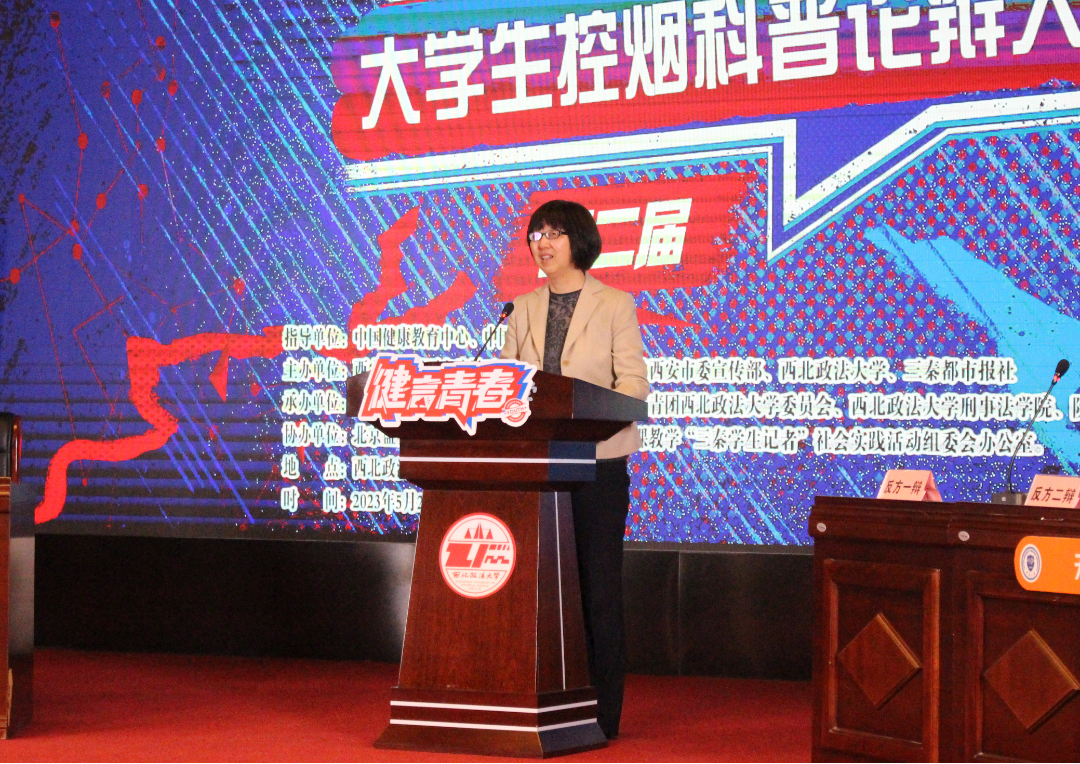 2023年5月22日,第二届“健”言青春大学生控烟科普论辩大会决赛暨颁奖典礼在西北政法大学长安校区满天星报告厅圆满落幕。比赛由中国健康教育中心、中国控制吸烟协会指导,西安市健康西安建设工作委员会办公室、中共西安市委宣传部、西北政法大学和三秦都市报社主办,由陕西省健康教育中心、西安市健康教育所、陕西新航公共卫生研究中心,共青团西北政法大学委员会和西北政法大学刑事法学院承办,由陕西省思政课教学“三秦学生记者”社会实践活动组委会办公室、北京盈科(西安)律师事务所协办。