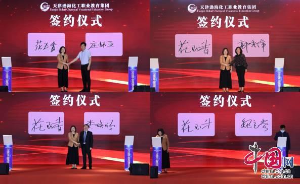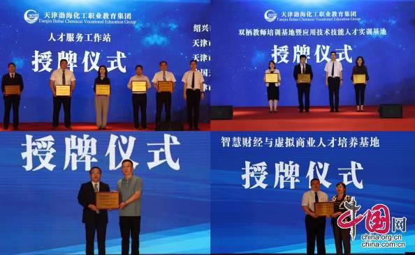 在签约和授牌仪式上,职教集团与天津渤化化工发展有限公司等本市、外埠9家企业签署了校企合作协议,为天津大沽化工股份有限公司等3家“双栖教师培训基地暨应用技术技能人才实训基地”授牌,为天津市经济开发区人力资源和社会保障局、绍兴市上虞区人力资源和社会保障局等5家“人才服务工作站”授牌。职教集团下属7家一线教学单位分别为中国石化润滑油有限公司润滑脂分公司、顺丰速运(集团)有限公司等7家“人才培养基地”授牌。