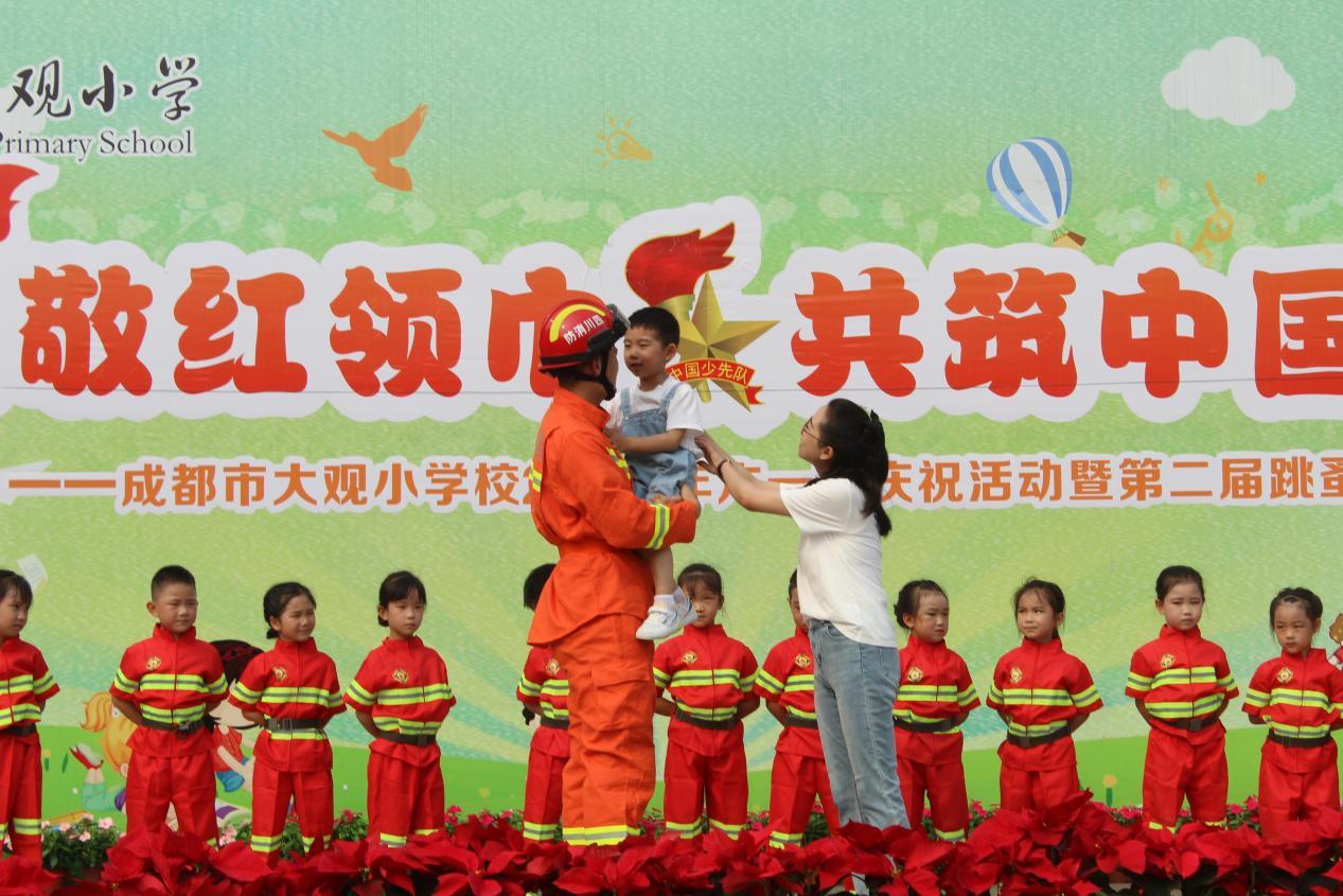 入队仪式充分展示了大观学子争做新时代好队员、为共产主义事业贡献力量的决心,精彩纷呈的节目展演则彻底点燃节日气氛。蹁跹袅娜的国风舞蹈《蜀绣》带大家领略传统文化之美;以消防员家庭故事为灵感的校园剧《我的超级英雄》展现了消防员危急时刻舍小家顾大家的奉献精神;合唱《世界等我出发》以歌为梦,激励师生勇敢踏上追寻梦想的新征程。