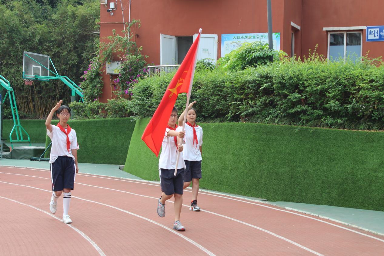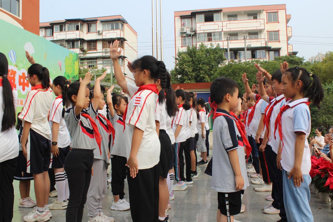 迎着初夏的朝阳,全体师生肃穆而立,合唱《义勇军进行曲》,以庄重的升旗仪式拉开此次活动序幕。随后,旗手们高举少先队队旗,伴着铿锵激昂的乐曲,迈着整齐矫健的步伐,昂首阔步地走向舞台。宣读新队员名单、为新队员佩戴红领巾、为新建中队授旗......在鲜艳队旗的见证下,42名佩戴崭新红领巾的新队员庄严宣誓、高唱队歌,正式加入中国少年先锋队。