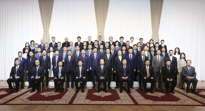 赵乐际委员长与正威国际集团董事局副主席、金融委员会执行主席张珈菱(3排右4)等企业家代表亲切合影