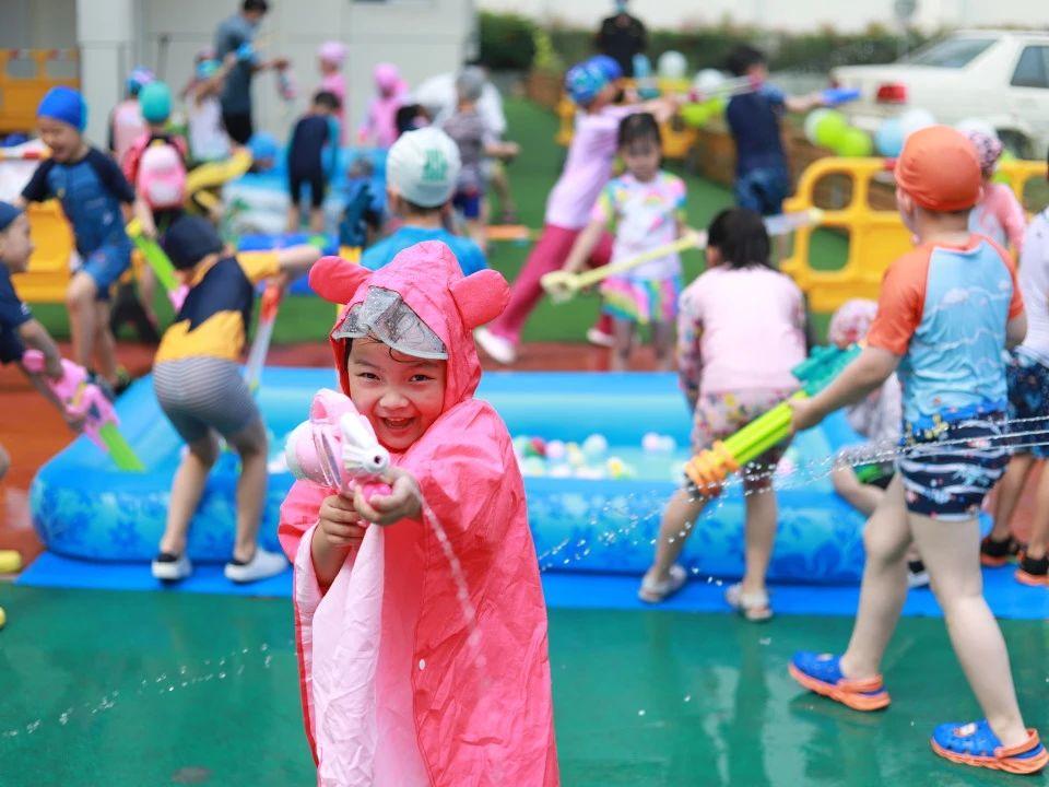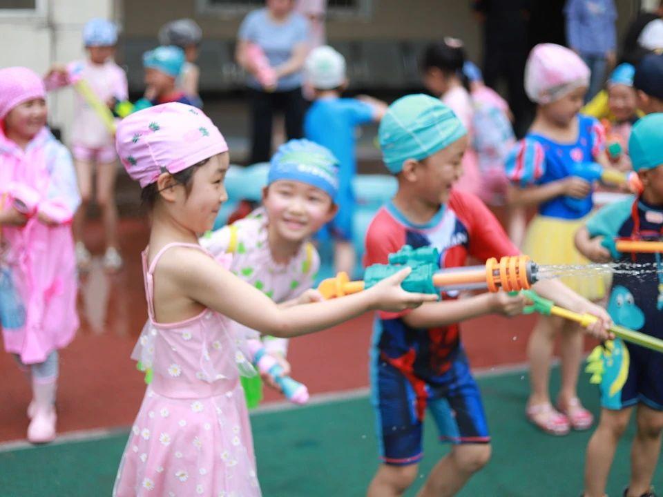 随后,孩子们身着泳衣、戴好泳帽、将水枪灌满水,开启了水枪大作战。水花浸润皮肤,快乐溢满心灵,校园充满了孩子们的欢声笑语,热闹非凡。