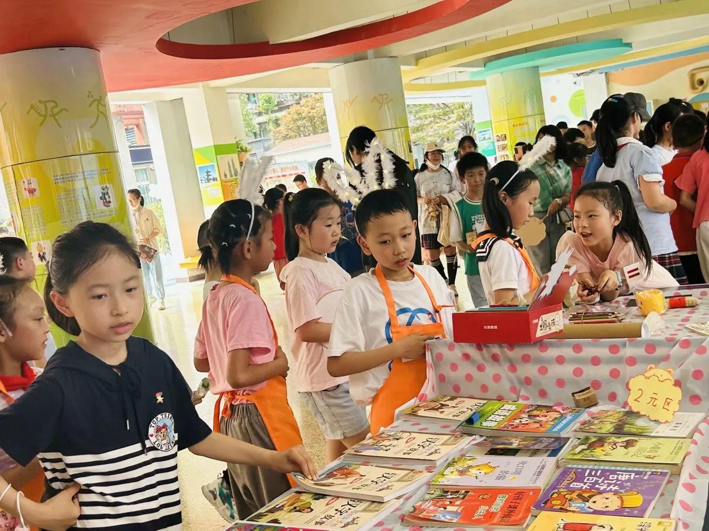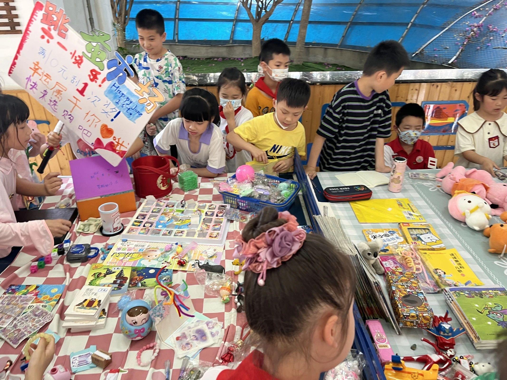 “瞧一瞧,看一看!”“该出手时就出手!”绿茵场上,近二十个摊位摆着招牌、立起海报,同学们将自己用过的图书、玩具、手工、文具等拿到“跳蚤市场”销售或交换。前来挑选、购买的同学和老师络绎不绝,吆喝声和讨价还价声不绝于耳,场面极其热闹。有买有赠、末尾打折、盲盒抽奖,各种促销手段层出不穷,“市场经济”意识在同学们头脑中种下一粒小小的种子,销售职业体验也让同学们大呼过瘾。