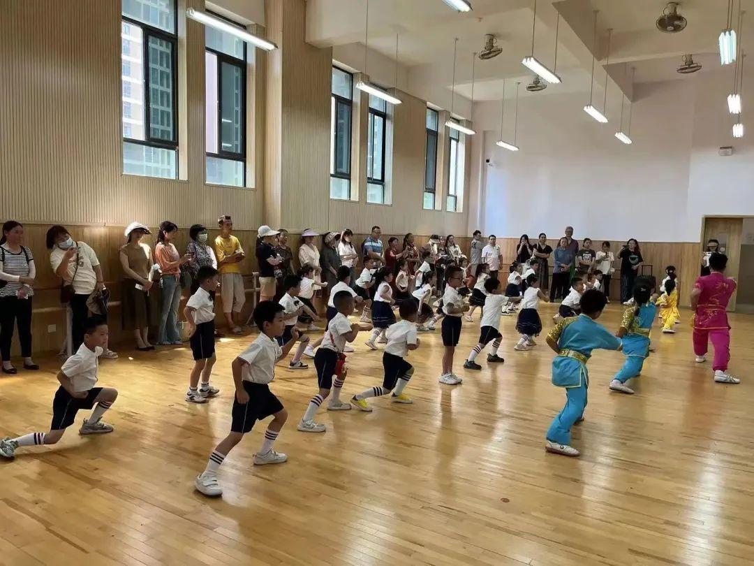 在体育馆,孩子们跟着小学体育老师学习打拳,伴着“大王叫我来巡山”的欢快音乐,气势满满。