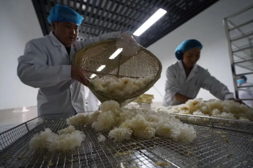 下一步,工人们再将银耳平铺于竹笆上沥干水分,放入烘干机烘干。