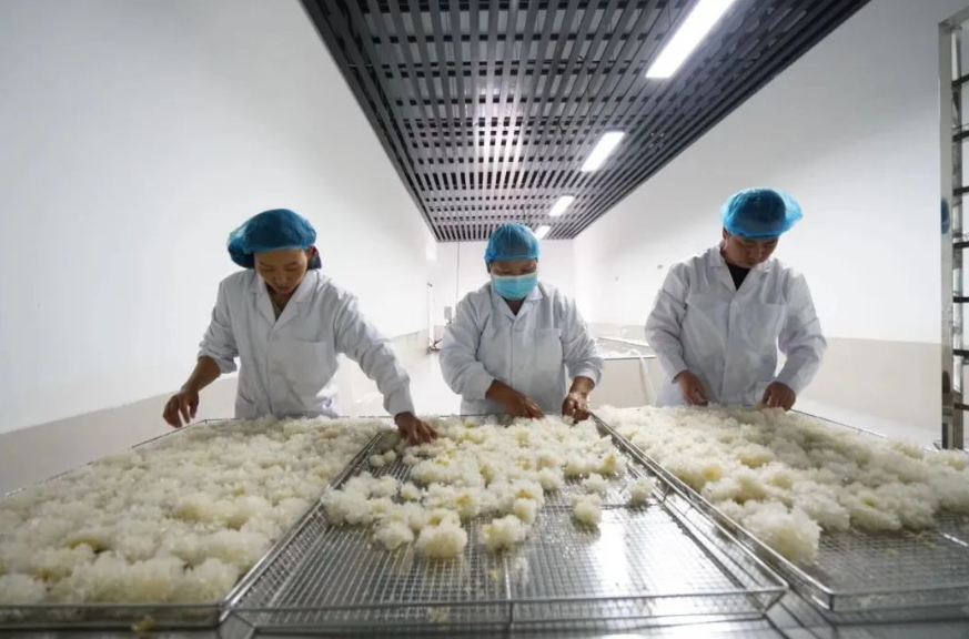 在四川省巴中市通江县银耳(食用菌)现代农业园区初级加工厂内,工人们将刚刚采摘的银耳,进行筛选、修剪、淘洗。