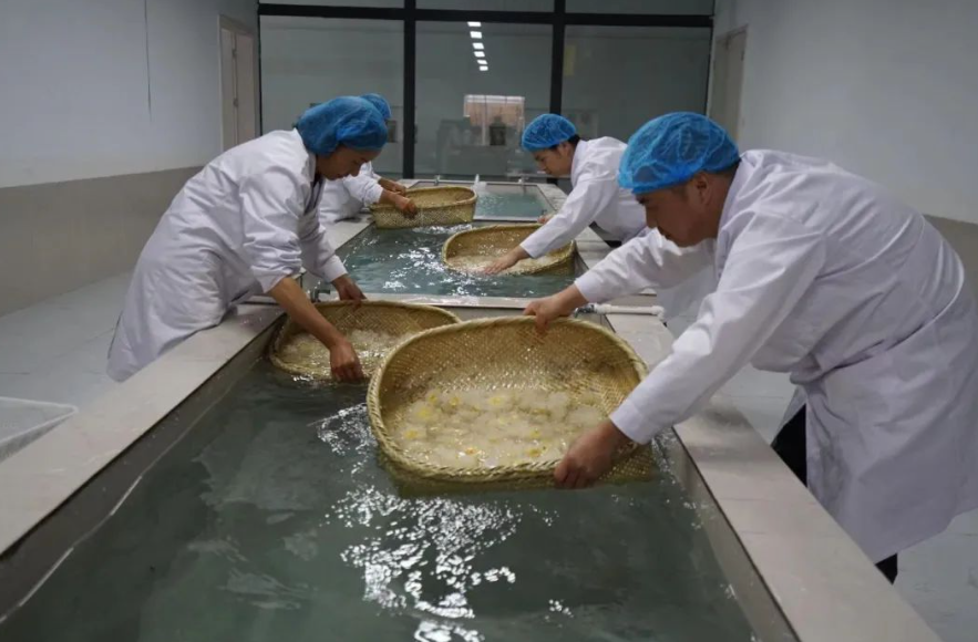 走进耳堂,一朵朵洁白的耳花,晶莹剔透、楚楚动人,采摘工人们小心翼翼地将一朵朵耳花从耳棒摘下,放入竹筐中。