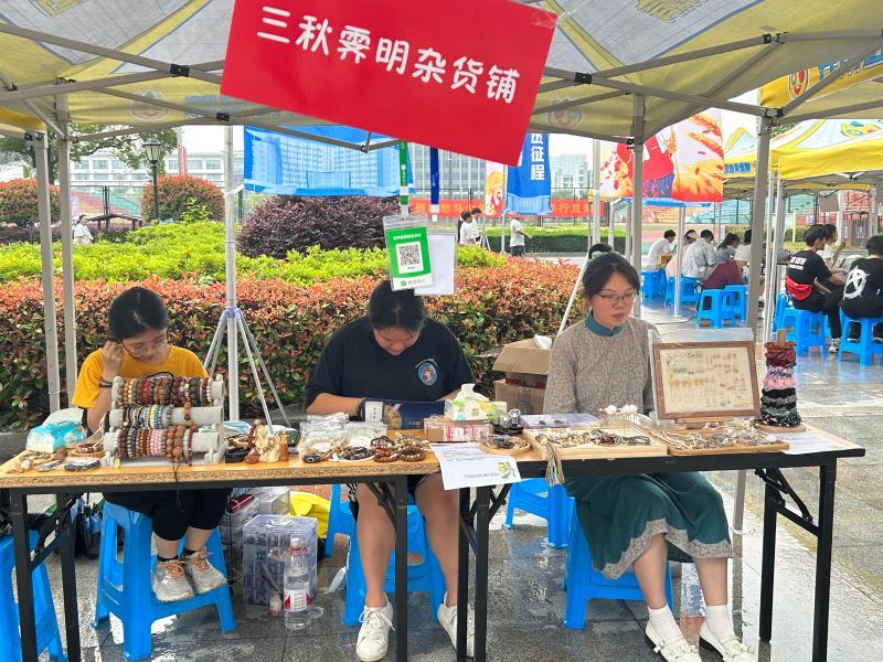 据了解,此次大学生实战周共有30个摊位展销,产品除了有大学生们自己做的小手饰、小吃、消闲食品和电子产品等,还有甘孜帮扶产品系列产品。为了活动引流,增加人气,大学生实战中“八仙过海各显神通”:在展位上,有可爱的青蛙玩偶、免费的ccd拍照、精美的小礼品、美妙的音乐旋律以及丰富的选品等,市场营销协会也安排了免费贴手机膜、送手机支架和抽奖等活动来助推。更吸引眼球是,学生们发挥专业特长进行“数实融合”,利用抖音直播间以直播新零售模式进行销售实战。