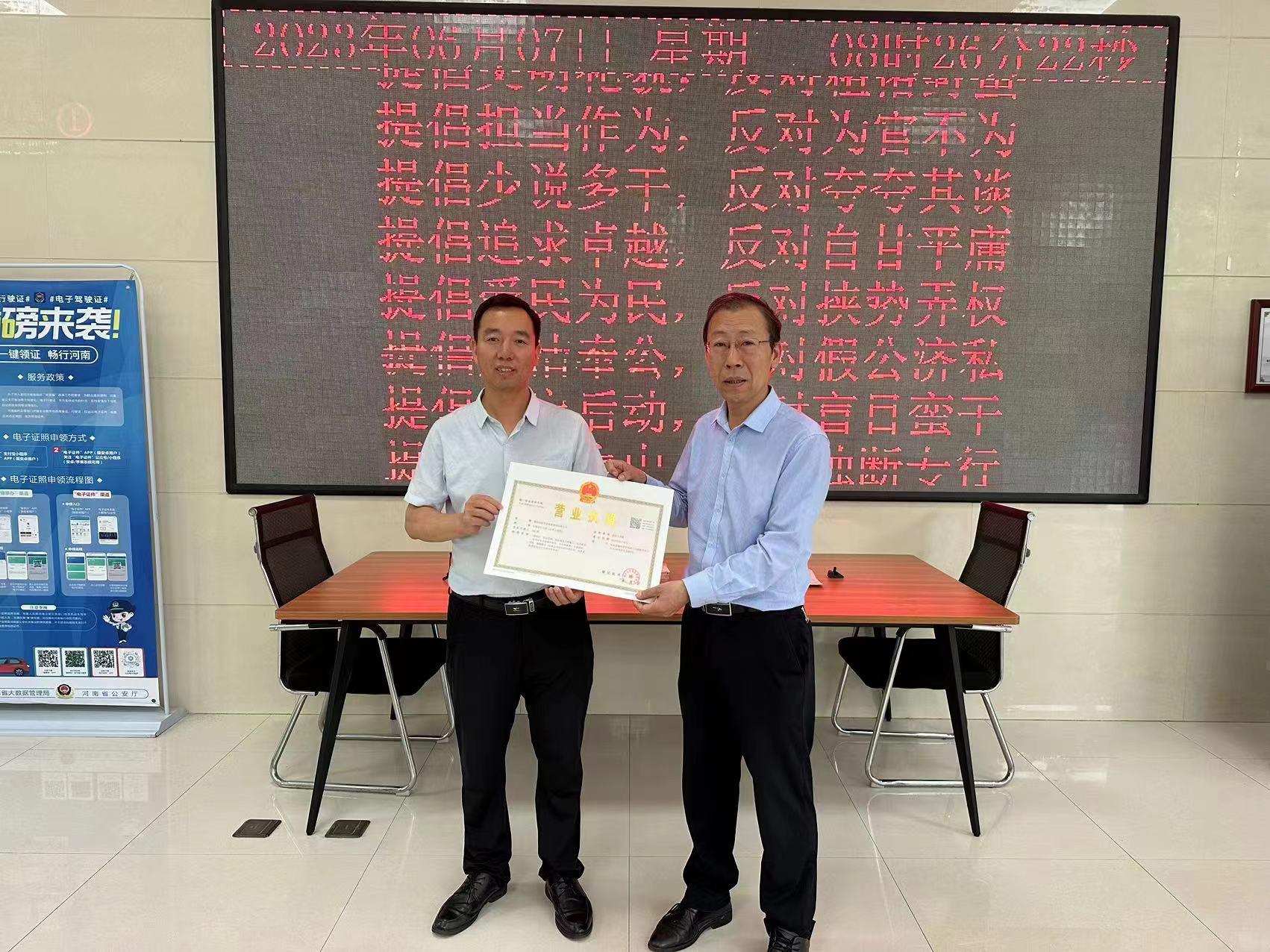 6月7日上午,濮阳市红管家物业管理有限公司负责人仲先生来到经开区行政服务大厅,在企业开办窗口办理企业登记,在窗口工作人员的指导下,一并填写了用电报装申请表,30分钟内从濮阳市市场监管局经开区分局局长王东山手中领到了营业执照,这张营业执照成为了濮阳市首张“企业开办+用电报装”营业执照,这也标志着濮阳市市场监管局依托全省全程电子化服务平台,积极加强与市电力公司合作,实现政企联办服务迈出了新突破。