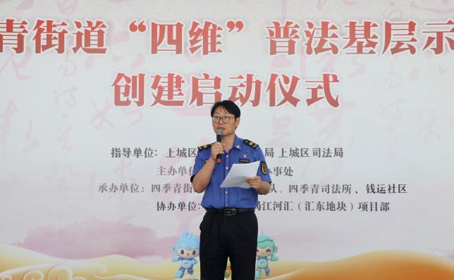 仪式上,街道党工委委员、执法队常务副队长李岗致辞。“四维”普法基层示范点创建工作是今年上城区“大综合一体化”行政执法改革标志性成果创建的重要内容之一,也是街区法治宣传工作开启新篇章的重要标志。根据省委三个“一号”工程,市委打赢“两场硬仗”的指导精神,街道执法队在普法宣传层面进一步提升迭代,从“空间、时间、形式、对象”四个维度突破创新,着力打造“走出去、请进来、讲得清、听得进、做得好”的“四维”普法基层示范点。街道执法队将借区“大综合一体化”行政执法改革标志性成果创建的契机,将普法工作推深做实,把“四维”普法品牌打出示范性与影响力,为全区大综合一体化改革及司法工作作出应有贡献。