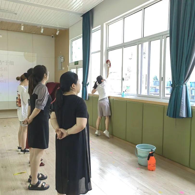 此外,干净、整洁、舒适的校园环境也至关重要。本着不放过一个细节、一个死角的原则,本次保洁组练兵以“一扇窗户”为主题。在笔试和面试的双重考验中,保洁阿姨思路清晰,步骤明确,尤其在实操环节,更是将“细、快、好”的娴熟技能展现得淋漓尽致,纷纷获得了在场评委的一致好评。保洁阿姨也表示一定在以后的工作中再接再厉,为孩子创造舒适、健康的生活环境。