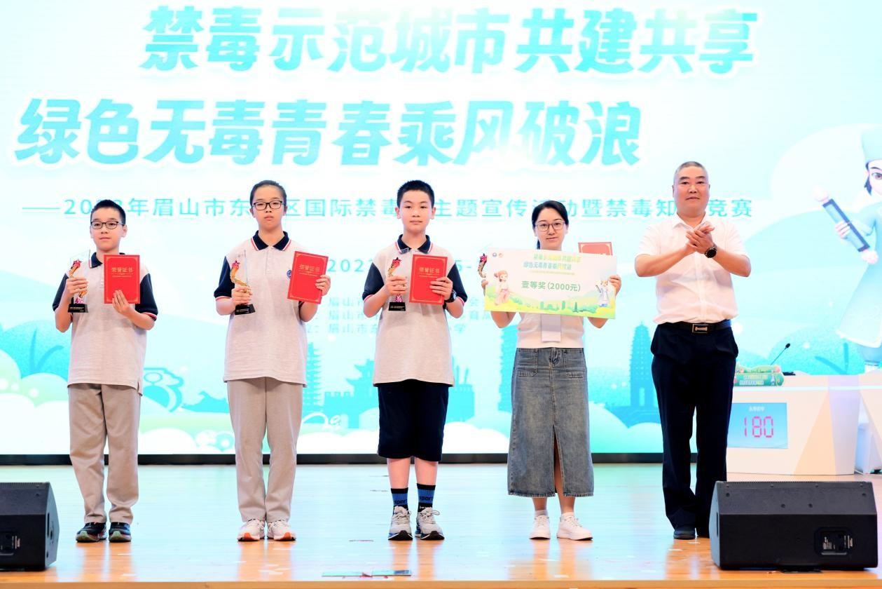 “恭喜来自百坡中学的三位同学,获得禁毒知识竞赛的第一名”。6月16日上午,由眉山市东坡区禁毒委员会办公室联合眉山市东坡区教育和体育局举办的“禁毒示范城市共建共享 绿色无毒青春乘风破浪”2023年眉山市东坡区国际禁毒日主题宣传活动暨禁毒知识竞赛圆满落下帷幕,经过初赛和决赛两轮比拼,百坡中学代表队从全东坡区的32支代表队中脱颖而出,以决赛280分,最终荣获竞赛一等奖。