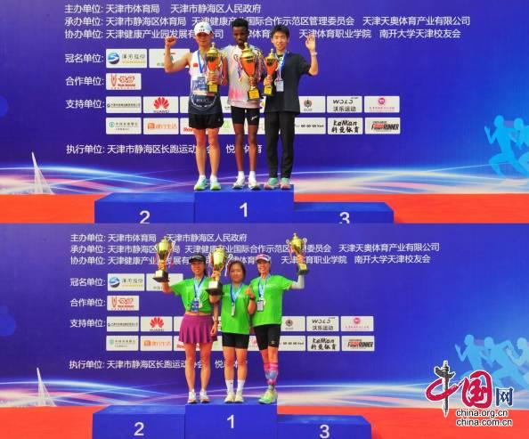 经过激烈角逐,男子组来自埃塞俄比亚的选手穆罕默德以1小时07分08秒夺得“半马”比赛第一名,来自天津的柯忠豪、来自北京的马翌轩分列二三名,女子组选手吴书晴以1小时20分43秒的成绩夺得“半马”比赛第一名,来自天津的刘丽丽、王华分别夺得二三名,参加健康跑和亲子跑的选手也都顺利完赛,尽享比赛喜悦。随后,参加活动的领导和嘉宾分别为获奖选手颁奖。