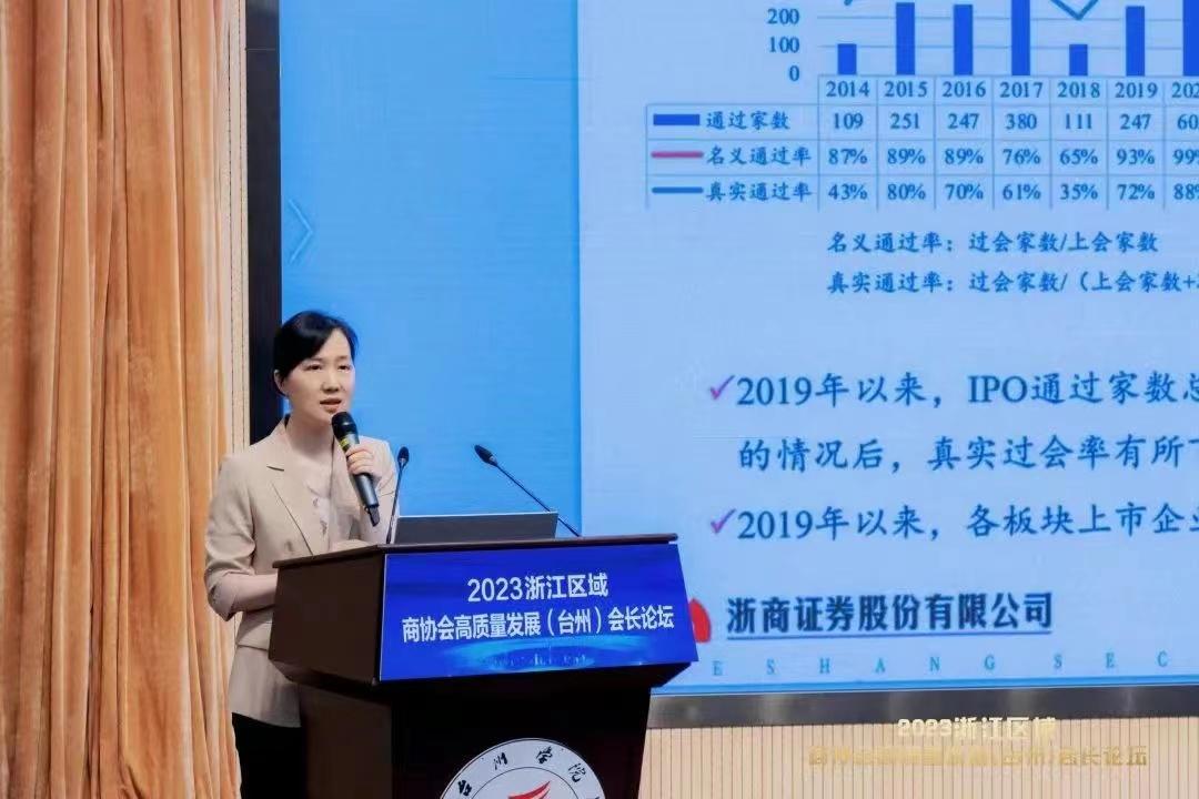 浙商证券股份有限公司投资银行业务行政负责人王一鸣女士带来《全面注册制下IPO政策解读》主题分享。她从全面注册制解读及各版块介绍讲到资本市场“台州板块”,并着重展示了上市流程及审核关注要点。她提到,近年来资本市场台州板块快速发展,已经成为国内资本市场的重要板块。截至2023年6月中旬,台州共计有68家A股上市公司。目前共有10家提交辅导备案、9家拟上市企业处于审核过程中,这将进一步助力资本市场台州板块的扩容升级。上市将为企业长久发展带来种种益处,但应重视上市中介机构遴选,确保企业成功上市。