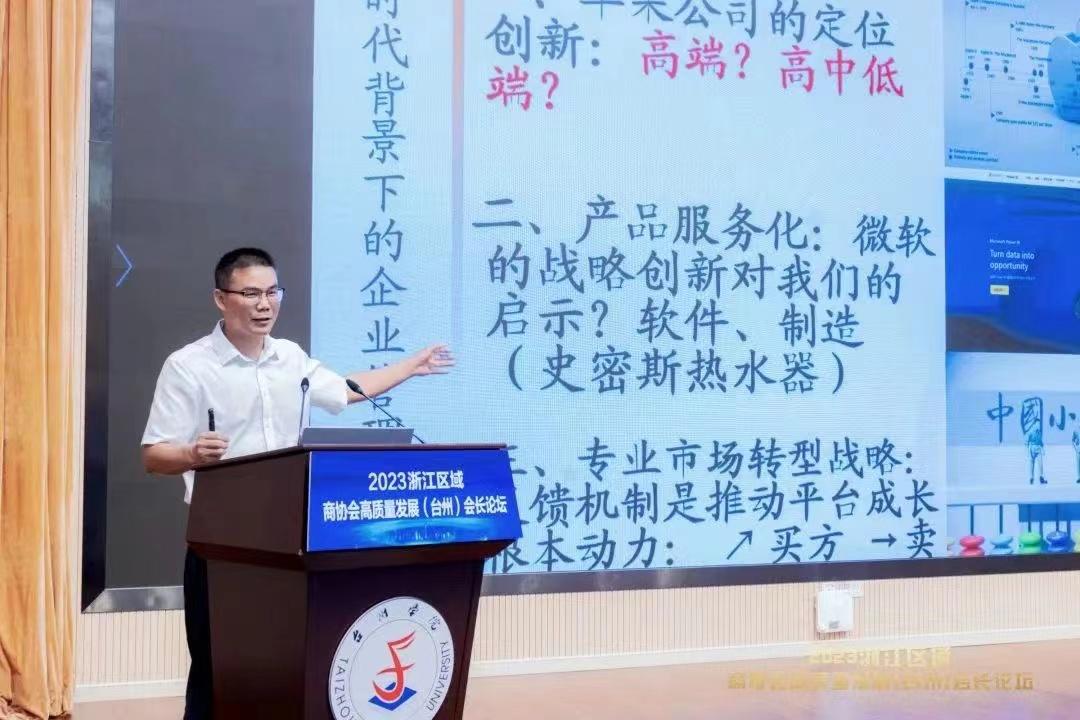 在主题分享环节,台州学院商学院院长、教授、博士生导师段文奇院长以《新形势下民营企业的管理创新》为主题进行分享,他提出面对让人眼花缭乱的新名词、新业态、新模式,应该洞察事物的本质,以不变应万变。他指出应从战略创新、商业模式创新、产品创新、研发创新、运营创新、营销创新、人才创新、供应链创新、融资创新、组织创新十大方面着手,做好管理创新,从而更好地应对新时代、新形势。