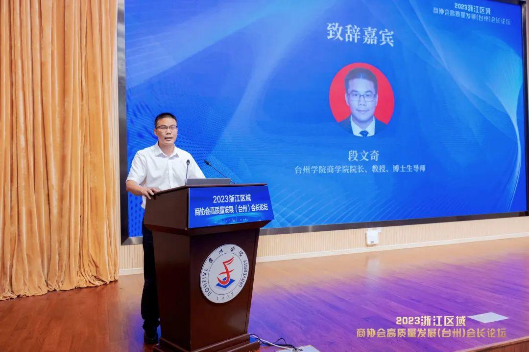 台州学院商学院院长、教授、博士生导师段文奇致辞。他代表台州学院商学院,向远道而来的各位嘉宾表示诚挚的欢迎和感谢,随后简要介绍了台州民营经济贡献和台州学院及台州学院商学院概况。他表示希望台州学院商学院以本次论坛为契机,以“会”为媒、以“会”结友,进一步做足服务地方社会经济高质量发展文章,讲好“中国式现代化”故事,走好“产学研创新路”。