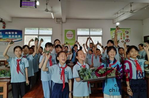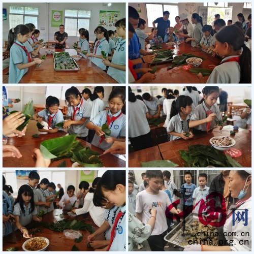 同时,德育处还组织三至六年级部分学生,在老师的带领下,进行包粽子体验活动。活动全程由老师手把手教学生包粽子,他们认真地卷粽叶,小心地把拌好的食材包入粽叶中,再细心地系好绳子,包出来的粽子形态各异,并不“完美”,但现场其乐融融,煮熟后,孩子们品尝着亲手包的粽子, 吃得分外香。