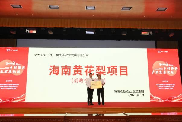 海南省农业发展集团执行总裁周辉为浙江一生一树生态农业发展有限公司总经理李建授牌并签约。