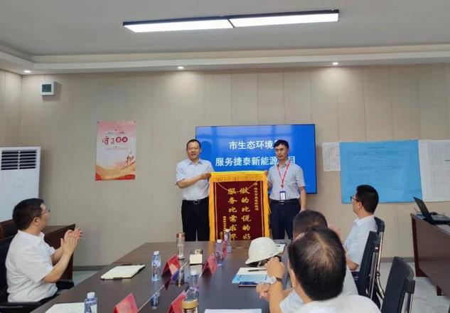 捷泰科技淮安基地主要负责同志向调研组赠送了锦旗,对市生态环境局对捷泰新能源项目的关心与支持表示感谢,并表态在今后的生产过程中,将严格遵守环保各项法律法规规定,严格把关污染防治工作各个环节。