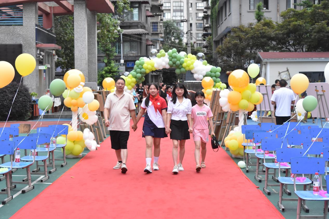 夜幕降临,昭小六年级毕业生身着盛装,携手家长一起踏上红毯,穿过“成长门”,在背景墙前合影纪念。熟悉的校园里,热情洋溢的气球、孩子们创作的书画作品、老师们用心装扮的活动场地使毕业氛围感十足。