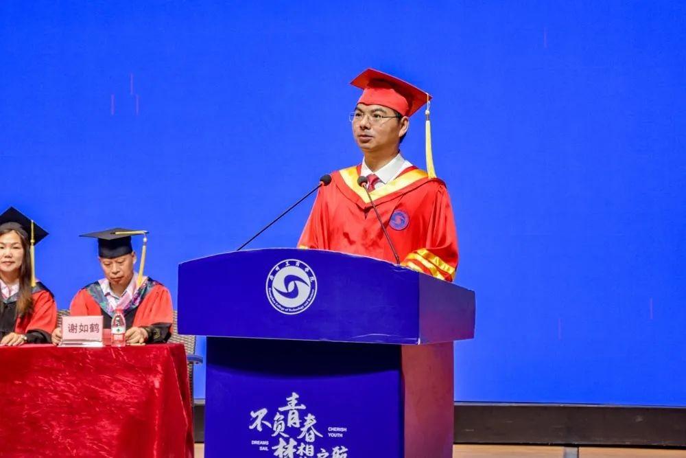 “2023届是光荣的一届,是先锋的一届”党委书记张振超充分肯定了毕业生大学四年的成长经历,“你们见证了中国共产党成立100周年和党的二十大胜利召开等伟大时刻,见证了战胜疫情的全过程,用不怕苦、敢冲锋的实际行动,展现了新一代广工商学子的责任与担当。”“今天的毕业典礼既是你们大学生涯的最后一课,也是你们奋斗征程再出发的人生起点。奋斗是青春最亮丽的底色,星光不负赶路人,惟愿你们能谨记母校‘正德厚生 励志修能’校训,一路乘风破浪,抵达理想彼岸。”
