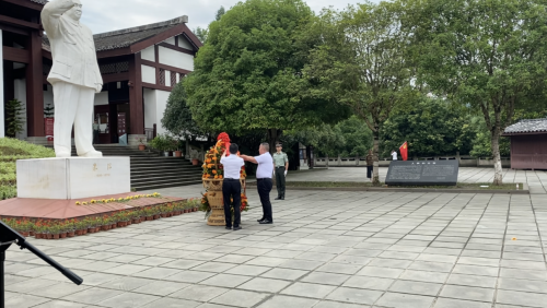 在朱德同志故居纪念馆前,大家怀着无比崇敬的心情列队肃穆,在礼兵的护送下,向朱德同志塑像敬献了花篮,中心党支部书记、主任张智同志,支部委员罗忠同志上前整理缎带,全体党员同志向朱德同志汉白玉塑像三鞠躬,深切缅怀朱德同志。