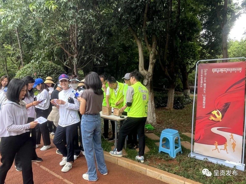 此次低碳跑比赛以环湖打卡为主线,沿途设置党的二十大精神、低碳环保、普法强基、经济金融4个主题打卡点,寓教于乐,在跑步打卡中汲取奋进力量。跑步间歇中,参赛者还不忘驻足合影留念,并拍下沿途美景,全程欢声笑语不断。