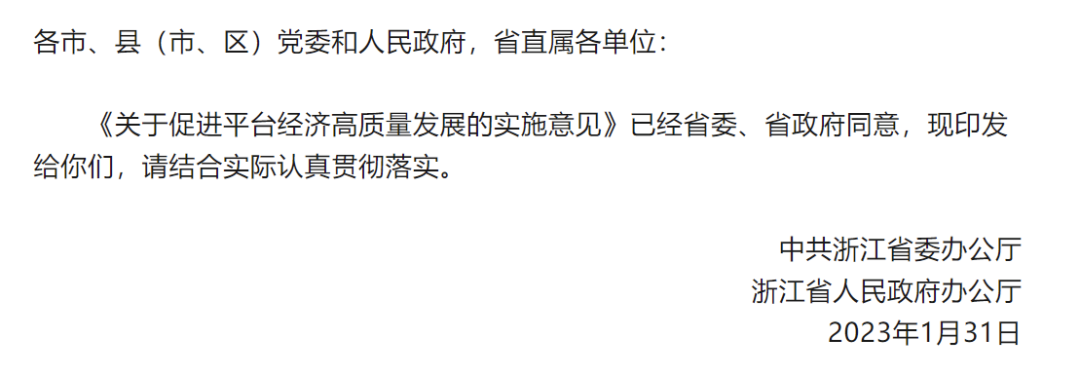 7月5日,浙江召开全省平台经济高质量发展大会。阿里巴巴、网易等100家平台企业代表受邀参会。这是全国首个以平台经济为主题的省域性大会,也是浙江首次以平台经济为主题召开全省层面的会议。省委书记易炼红,国家市场监督管理总局党组书记、局长罗文出席会议并讲话,省委副书记、省长王浩主持。