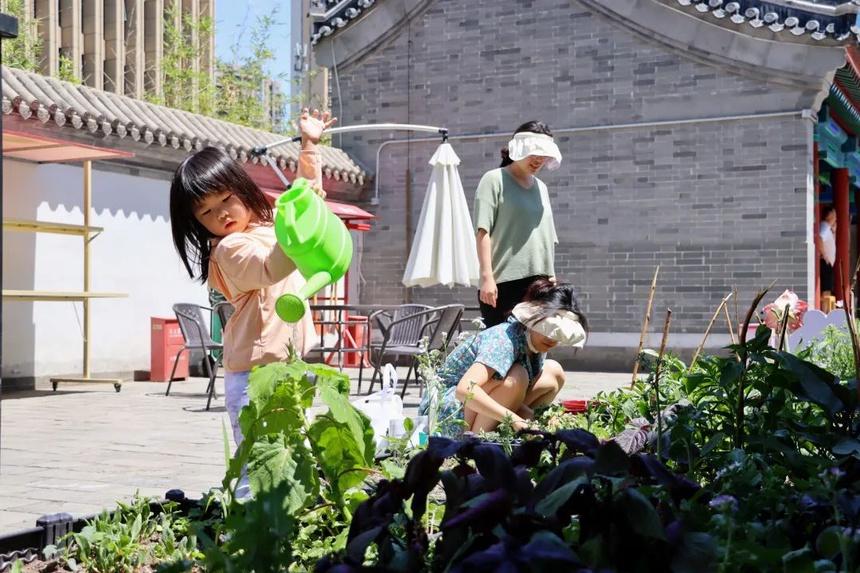 以用户黏性很高的“一米菜园”活动为例,寺锦目前已开展3期菜园认领活动,通过在古建筑里开辟多个一平方米的小天地,邀请周边居民做菜园主人。如今,10多个家庭认领了小菜园,韭菜、小葱、菠菜等田园风光已成为寺锦的一道独特风景。7岁的小树和妈妈半年前认领了一块小菜园,他们隔一天就来给种的萝卜、西红柿浇次水。谈到从劳作到收获的点滴,小树开心又得意。小树妈妈感慨:“这个活动既有趣又有意义,孩子从选种、播种、育芽、浇水、施肥到收获,全程参与,既亲近了自然、收获了美味,也增强了责任感,邻里关系也因此更和谐。”