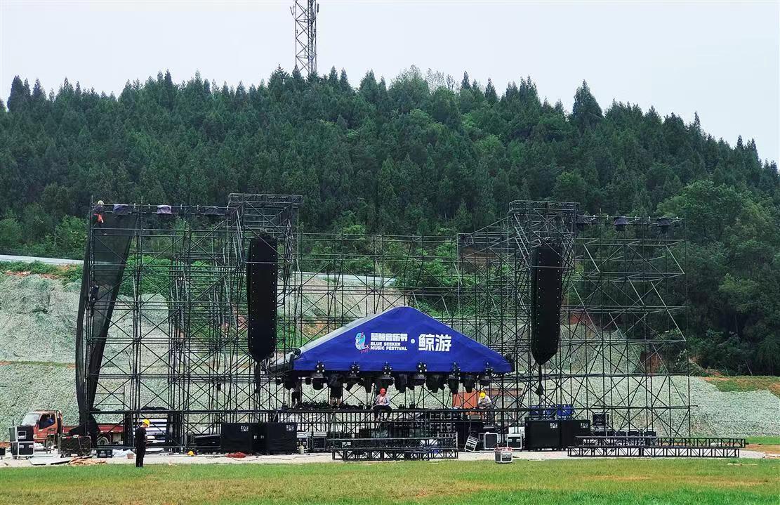 “蓝鲸音乐节三个舞台主体结构已基本完工,我们正在对主体结构进行加固和稳定工作,灯光、音响、显示屏也同步进行安装,明天可以完成灯光、音响、显示屏所有的测试。”现场工作人员介绍道。