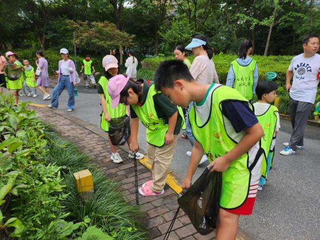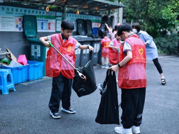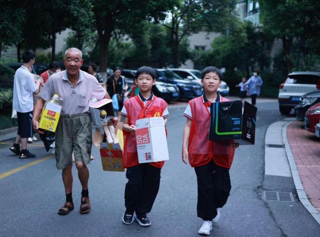 垃圾分类快乐“童”行,扮靓家园有你有我。暑假如约而至,为让社区青少年俱乐部的小志愿者们通过自己的实际行动,为扮靓家园迎接亚运贡献一份自己的力量。四季青街道联合五福、江锦社区组织辖区青少年开展垃圾分类、环境清洁志愿行动。“爷爷,纸板属于可回收物,应该扔在蓝色垃圾桶,让我们来帮您吧!”几个小志愿者看到一位爷爷正提着大包小包的垃圾前往投放点,立刻迎了上去。接着,小志愿者们忙碌了起来,当起了小小督导员,两人一组驻点垃圾投放点,对每一位前来投放垃圾的居民进行正确引导,并通过发放宣传手册的方式向居民普及垃圾分类知识。随后,在社区工作人员的带领下大家手持钳子、黑色垃圾袋对小区绿化带、楼道、公园内的烟蒂、白色垃圾等进行捡拾并分类投放。炎炎夏日,小小志愿者们用自己的行动及汗水为美丽家园贡献了自己的力量,也成为了小区内一道靓丽的风景线。