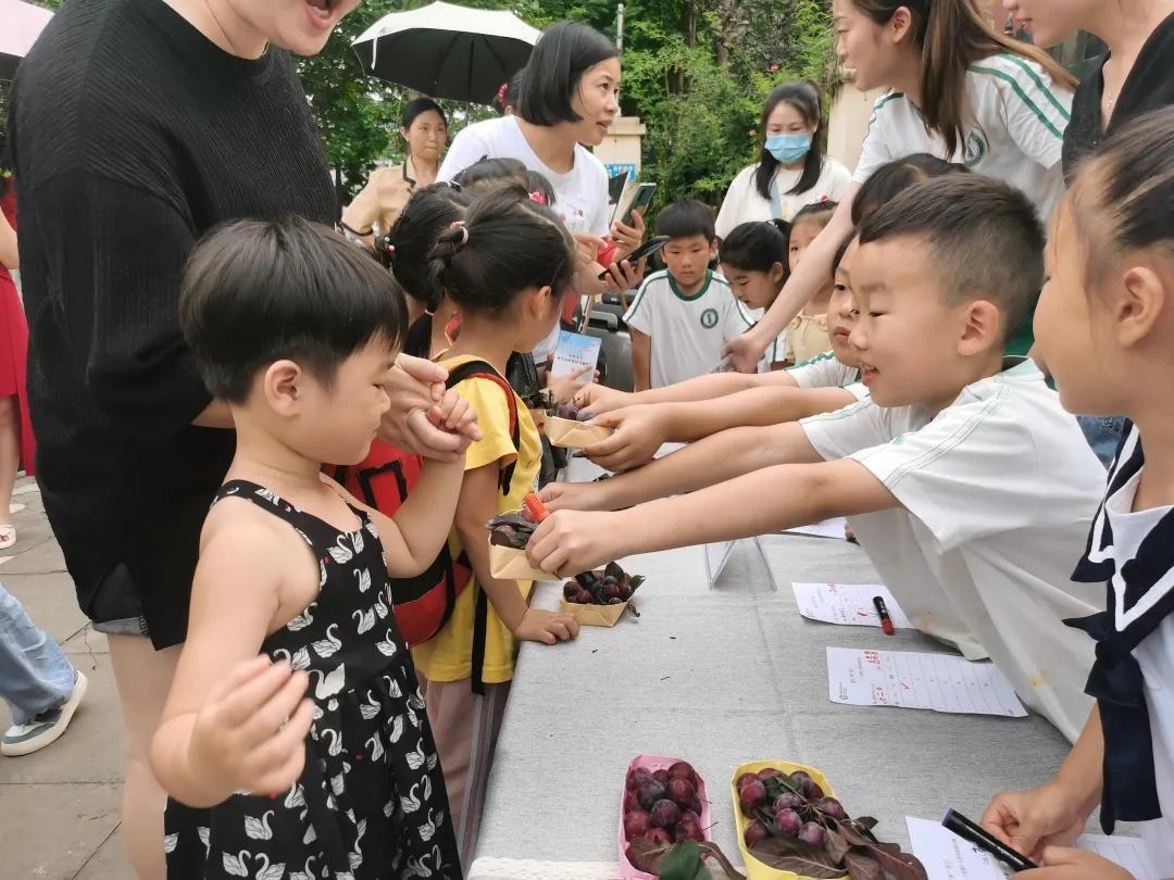 孩子们在老师的组织下拿着篮子来到幼儿园的李子树下进行采摘,大家搭梯子、扶梯子,相互配合,一会功夫就摘下不少李子。随后,孩子们将采摘下的李子分装义卖,大家化身“超级推销员”,十分卖力。