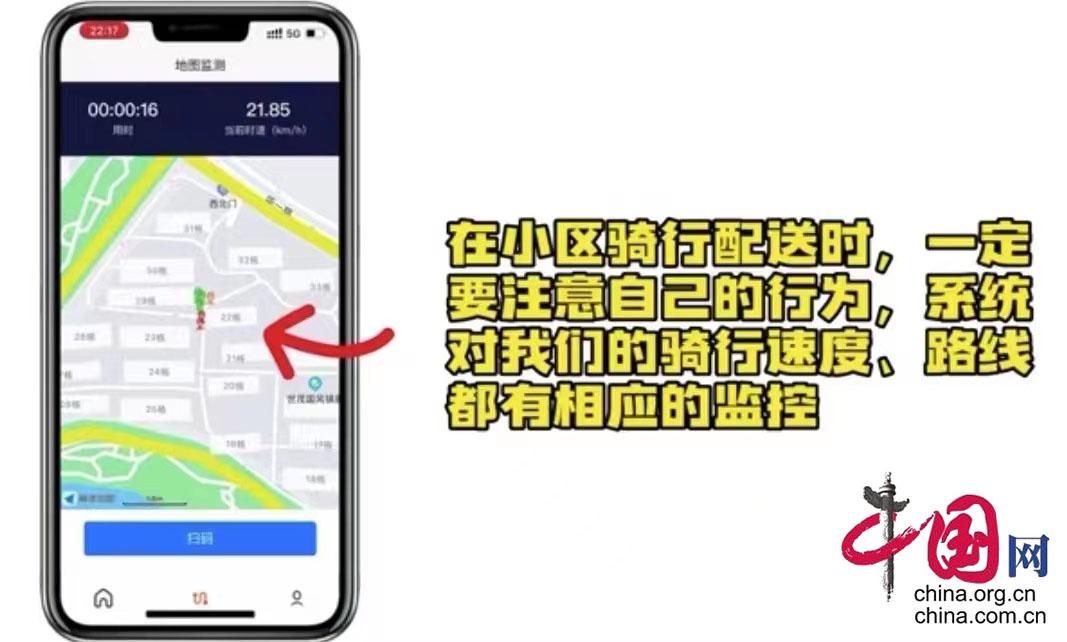 在为外卖骑手提供方便的同时,“骑码进门”App也对骑手进入小区后的行为进行了规范,给居民提供了安全、有序的生活环境。外卖骑手进入小区后,骑行速度必须控制在15公里/小时以内,瞬时超速App将对骑手进行提醒,持续超速将被停权。通行证实行实名认证、社区备案、一人一码,出现问题可线上追溯。骑手进入小区后必须按照规划路线骑行,行程轨迹将被全程记录。居民、物业发现骑手的违规行为,可向社区投诉停权。