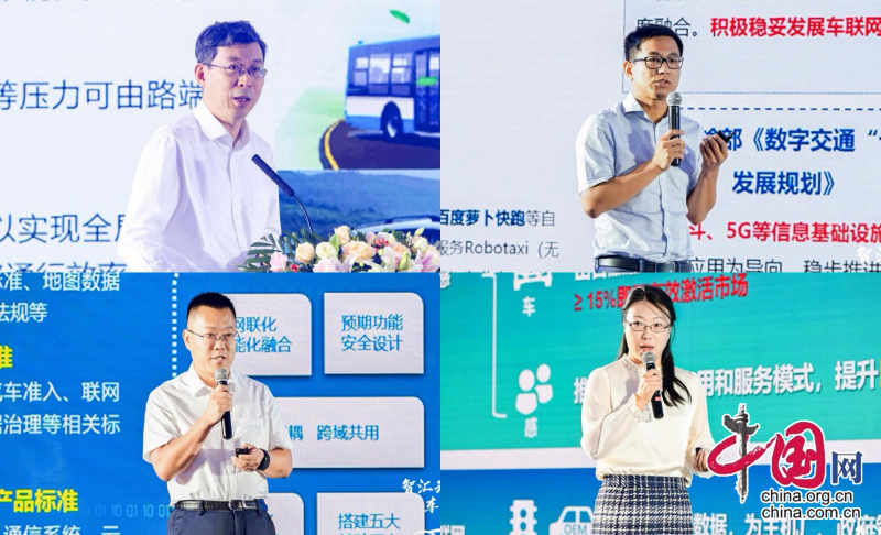 在主题演讲环节,IMT-2020 C-V2X组长、中国信息通信研究院车联网与智慧交通研究部主任葛雨明,中信科智联科技有限公司副总经理、移动通信及车联网国家工程中心车路协同首席专家张杰,国家智能网联汽车创新中心架构事业部总经理唐风敏分别作主题演讲。(上图右下)