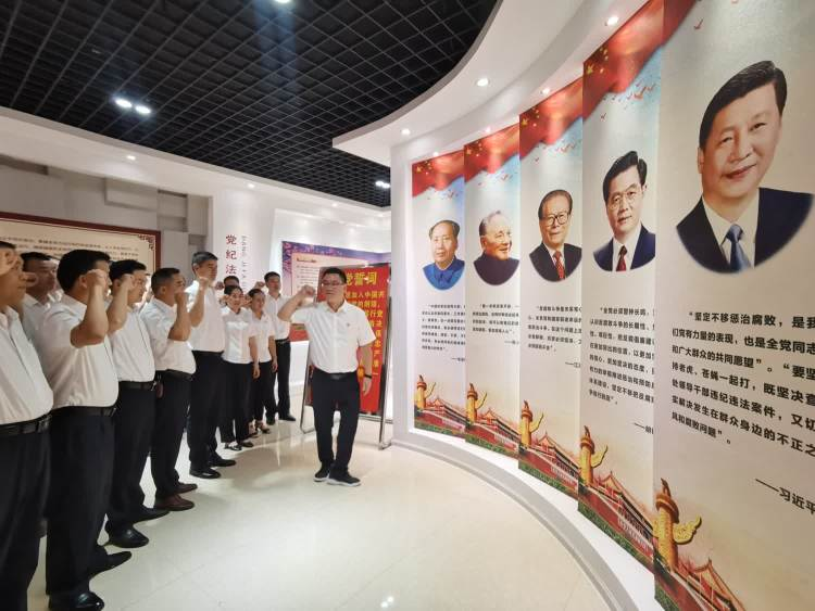 在廉政教育基地内,全体党员还开展了重温入党誓词,再次感受入党时的初心和使命。