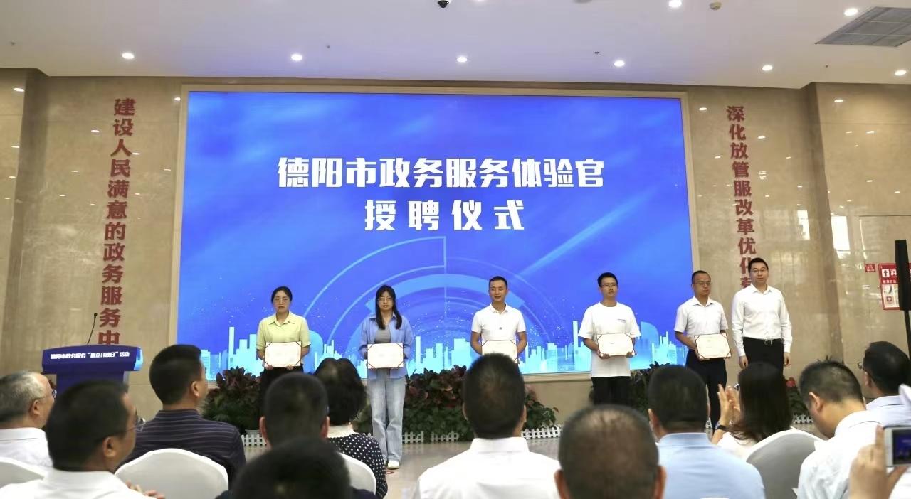 此次活动还特别授聘了来自英杰电气、三环科技、四川逢春制药有限公司、四川江中源食品有限公司、德阳新希望六和食品有限公司的5名企业代表为“政务服务体验官”,“体验官”们将在为期一年的政务服务体验活动中,以“坐窗口、走流程、优服务”的“政务服务人员”身份亲身体验政务服务工作并进行全程监督。