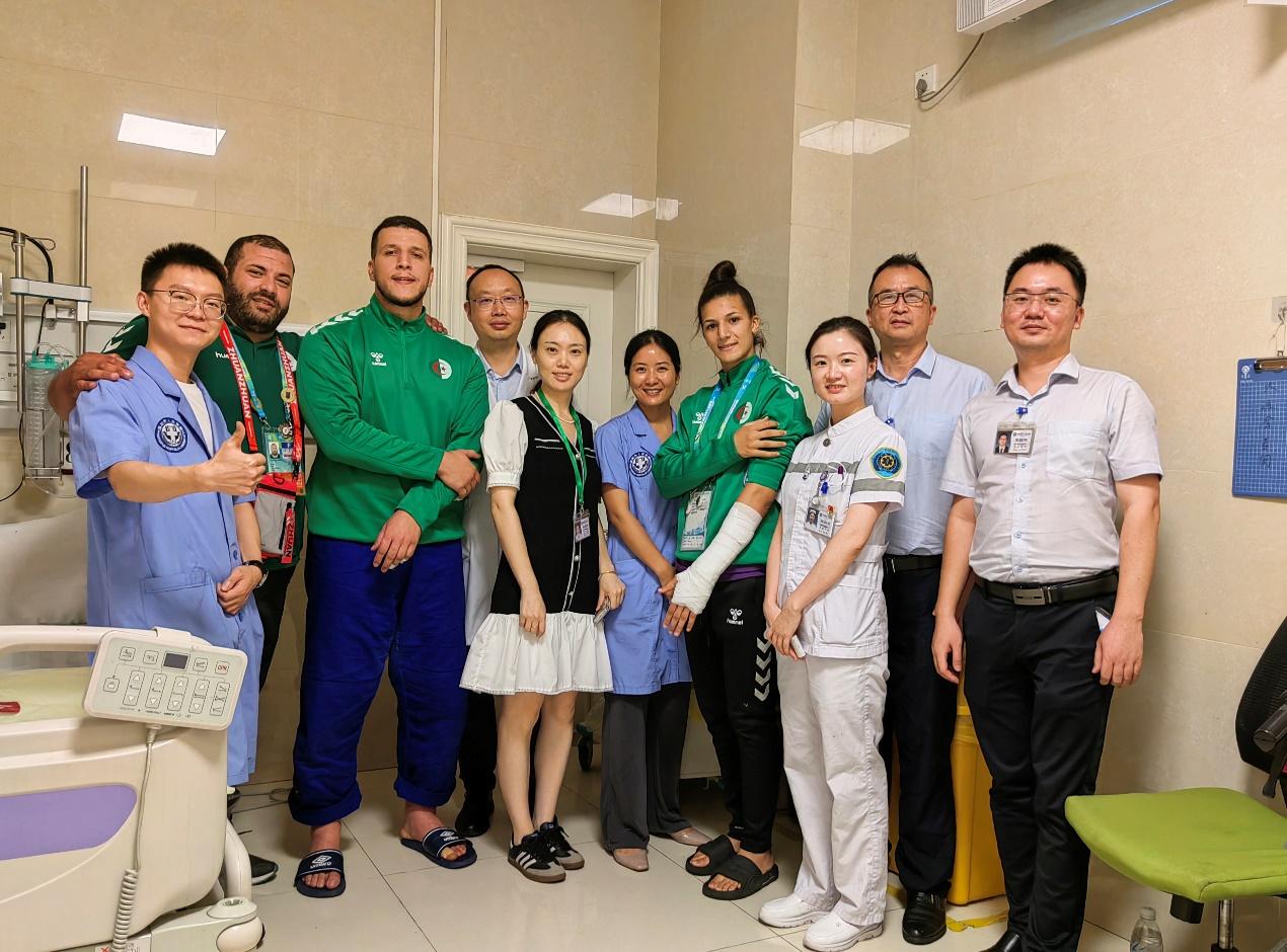 柔道比赛开始的第一天,医务人员们就迎来了考验。陈俊医生通过电话了解到,一位摩尔多瓦运动员在比赛过程中突发肩关节复发性脱位,已在急诊进行了X线检查,排除了肩关节骨折。见到患者后,陈俊向其讲解了中医手法整复对于骨折、脱位可以达到非常好的效果,得到对方的同意后,一手轻柔缓慢的牵住患者左手,稍作旋转,另一手扪住左肩,手指轻轻一扣,短短一两秒钟,患者痛苦面容随之消失,开心的举起大拇指,随后也配合陈医生做了固定处理。