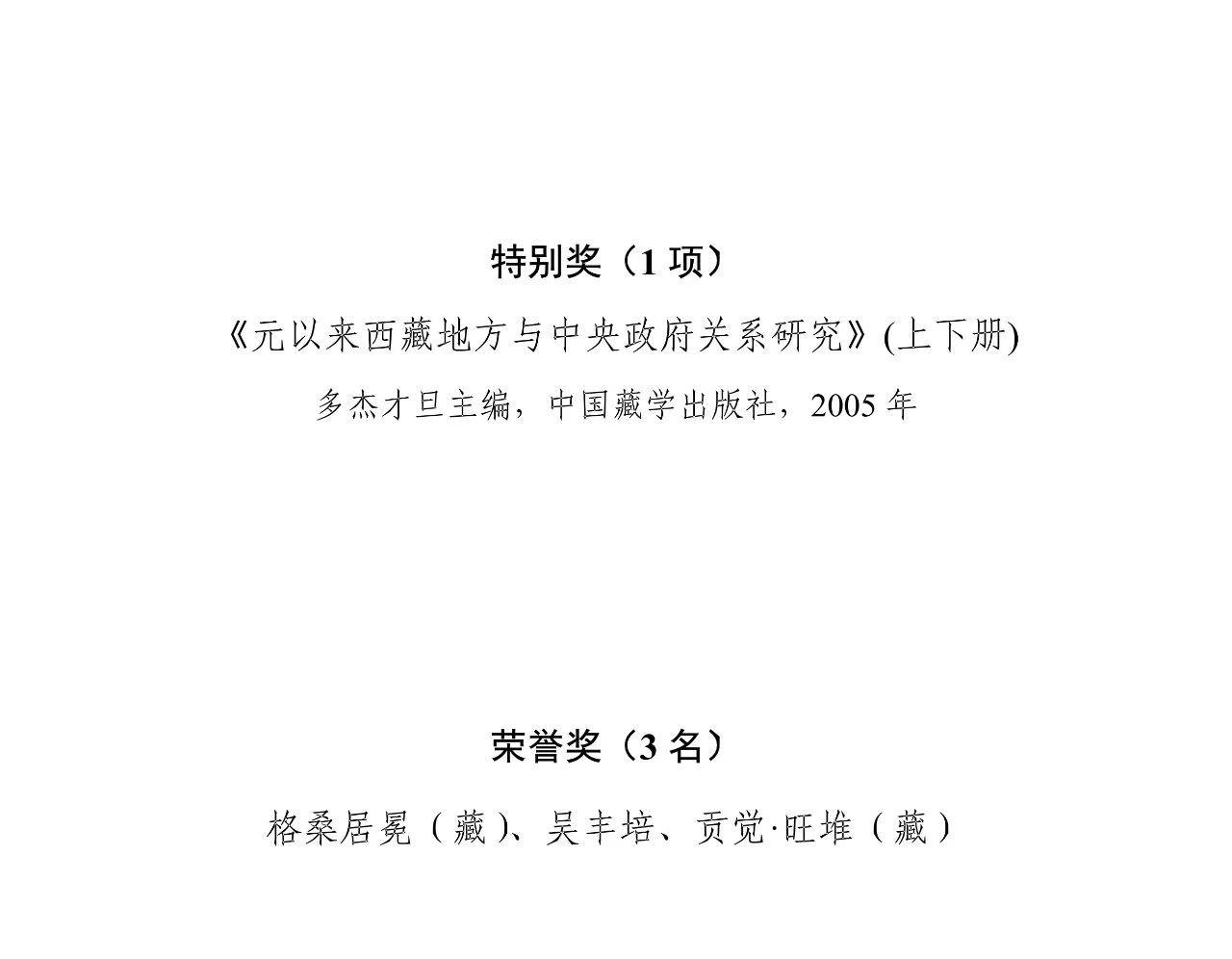 另外,经评审委员会全体会议无记名投票表决,《元以来西藏地方与中央政府关系研究(上下册)》荣获第五届中国藏学研究珠峰奖特别奖;格桑居冕(藏族)、吴丰培、贡觉·旺堆(藏族)荣膺第五届中国藏学研究珠峰奖荣誉奖。