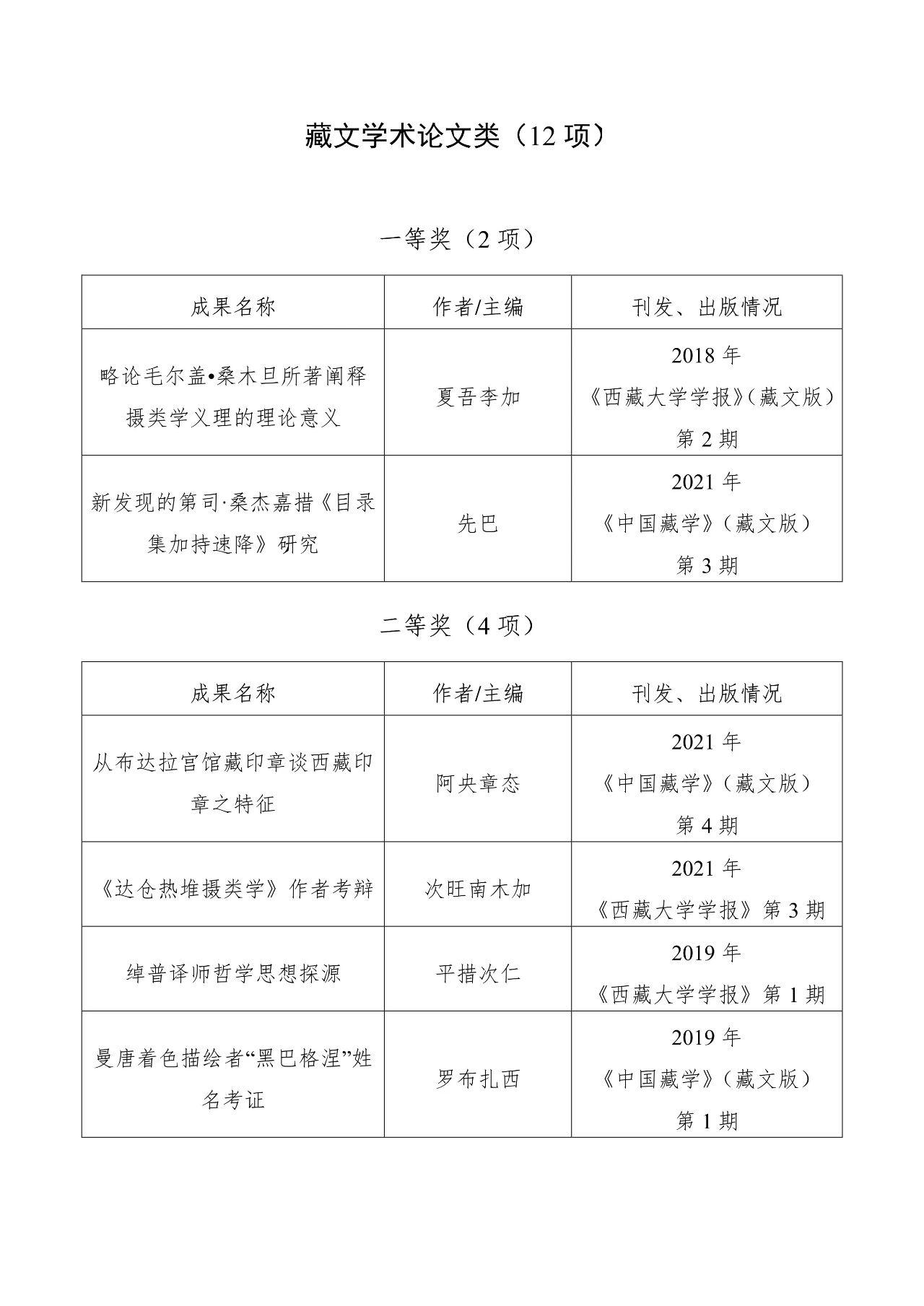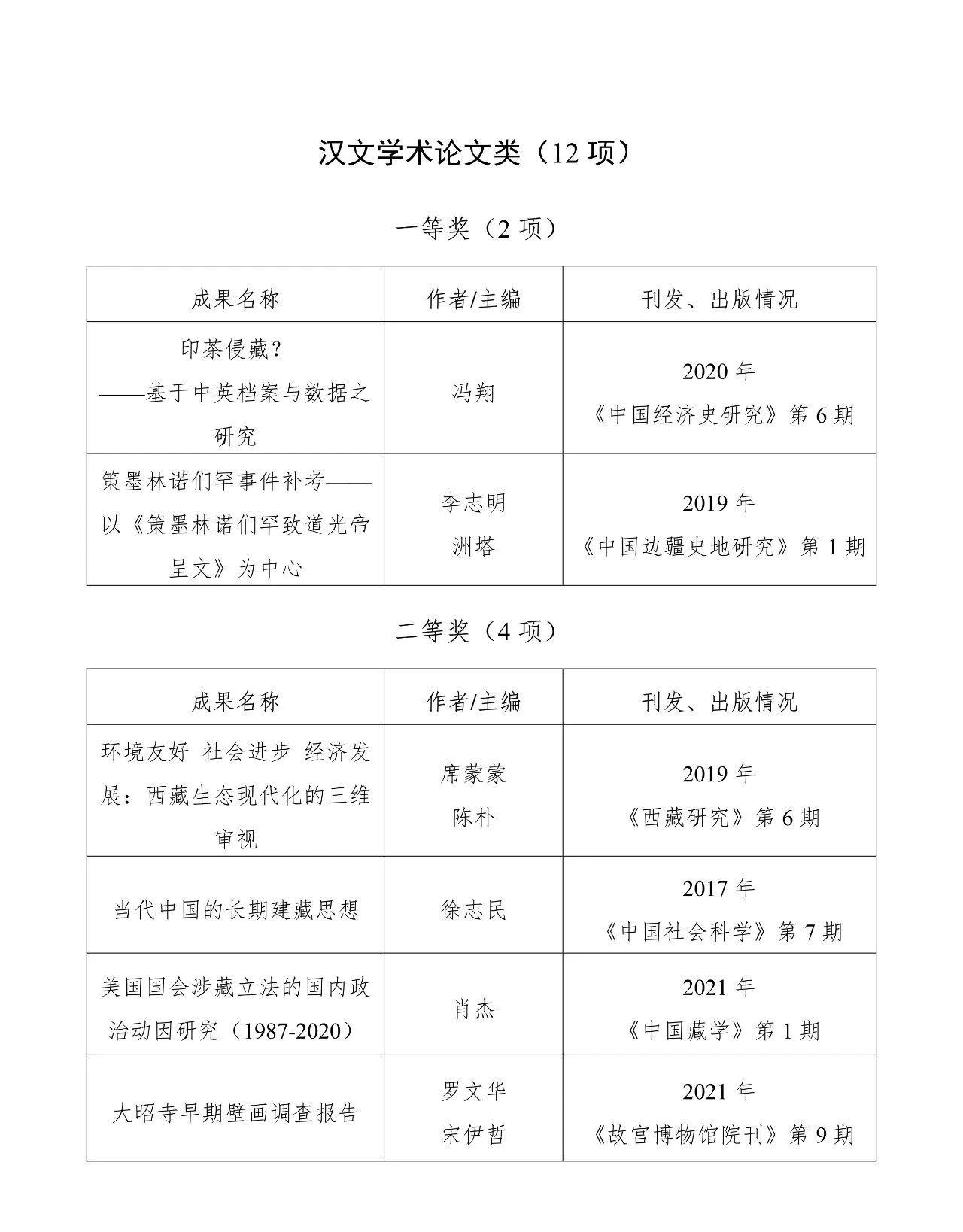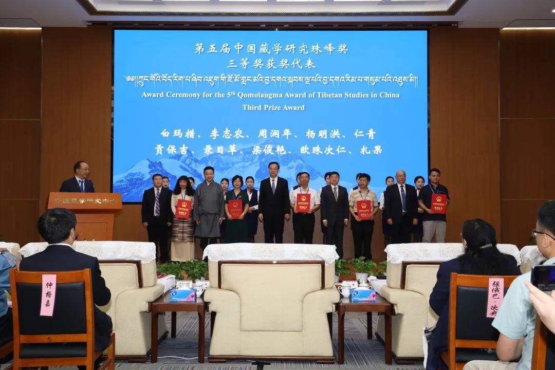 本届中国藏学研究珠峰奖评奖工作于2022年启动,共收到包括西藏、青海、台湾在内的19个省市和地区的97家藏学研究机构申报的480项成果。经学科组和评审组审议,共64项参评成果荣获第五届中国藏学研究珠峰奖各类奖项,分别为:汉文研究专著类12项,藏文研究专著类12项,汉文学术论文类12项,藏文学术论文类12项,英文研究成果类6项,基础资料成果类6项,青年优秀成果奖4项。