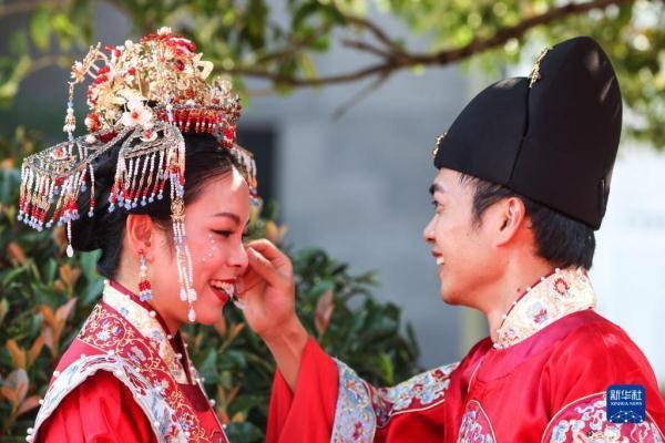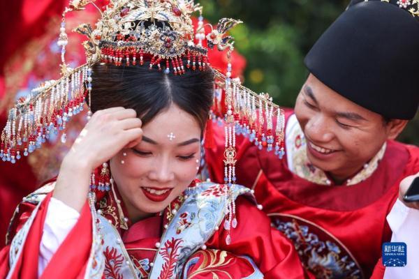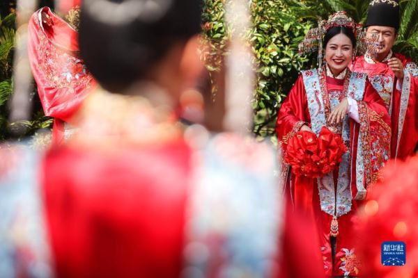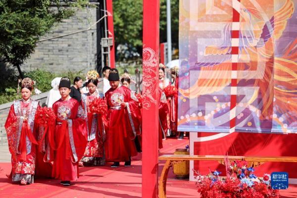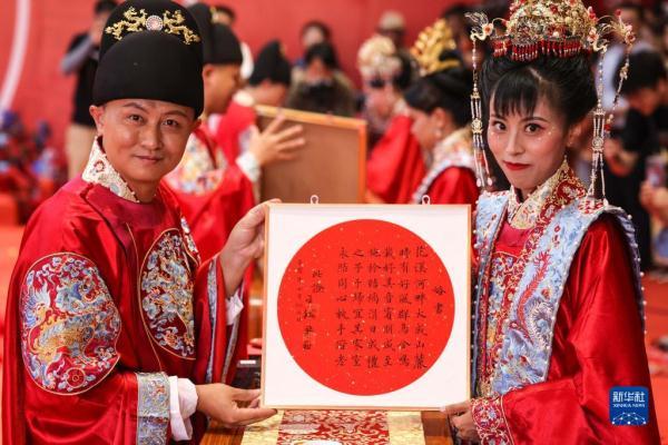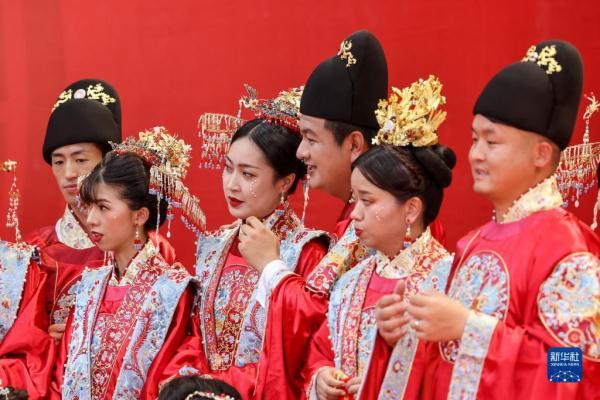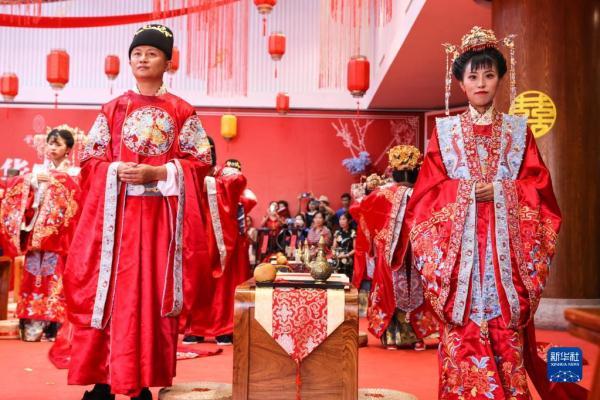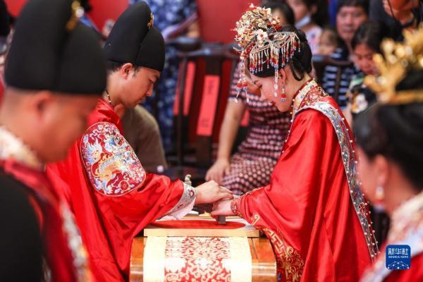 当日是七夕,2022(壬寅)年贵阳孔学堂中华婚礼在贵阳孔学堂举办,12对新人身穿中式婚服通过合卺礼、解缨结发、共书婚帖等方式完成传统婚礼仪式。