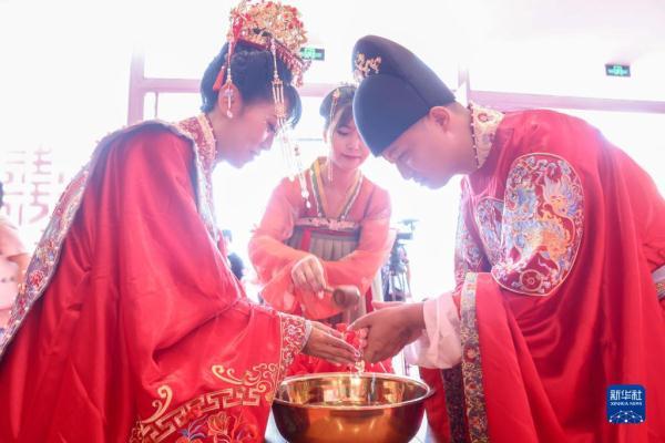 2022年8月4日,新人在婚礼仪式上引水沃盥。