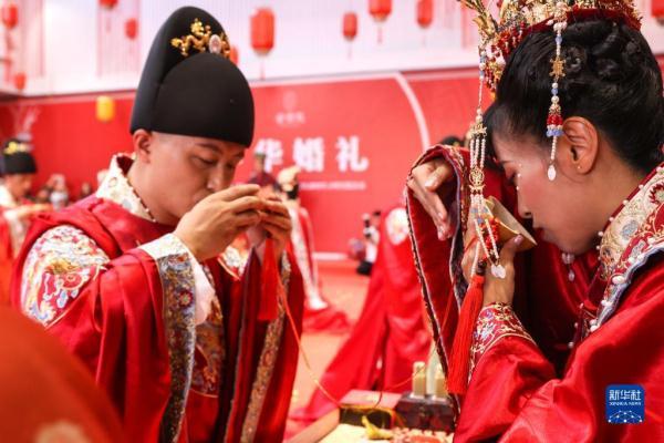 2022年8月4日,新人在婚礼仪式上行合卺礼。