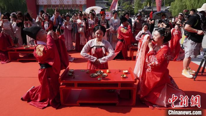 记者在活动现场看到,七对参加唐宫婚礼的新人们在华清宫霓裳阁完成盛唐妆造后,由大唐宫廷仪仗队引领,依次完成传毡、跨马鞍、帝妃赐婚、合卺礼、共结镜钮、新人交拜、敬天祈福等唐代传统婚礼仪式环节。