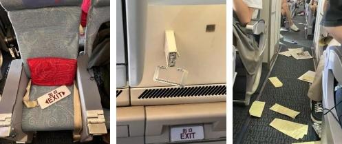 安全出口指示牌被甩出的乘客撞飞,客舱内物品散落一地